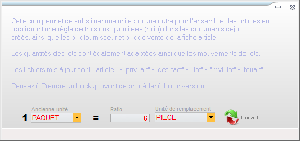 Ce module permet de substituer une unité par une autre pour l’ensemble des articles dans les documents déjà créés. L’unité reprise dans la fiche signalétique de l’article sera également remplacée, ainsi que les quantités des lots et les mouvements de lots.