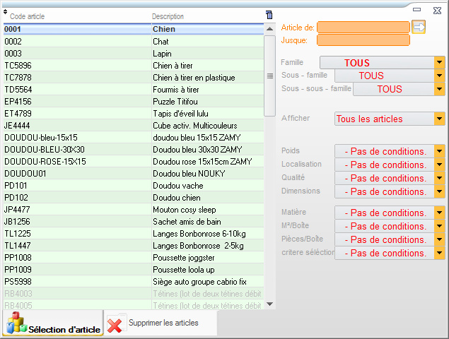 Les articles à supprimer sont filtrés par le code article, par les familles ou par les critères personnalisables.