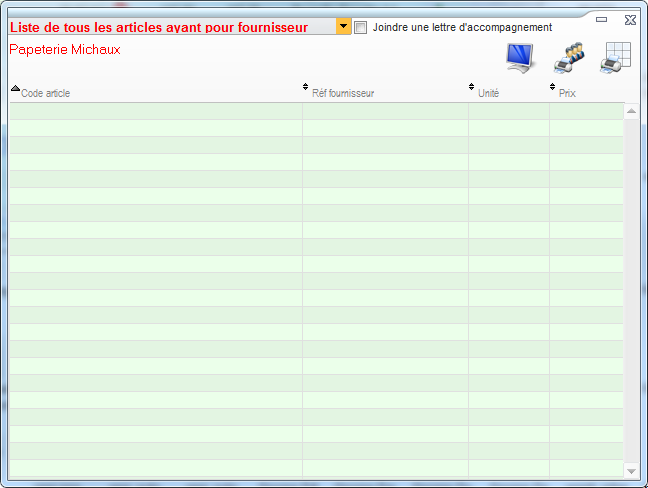 Il est possible d’imprimer une liste d’articles existant chez tous les fournisseurs pour le destinataire spécifié et le document en cours ou une liste d’articles pour le fournisseur en cours.
