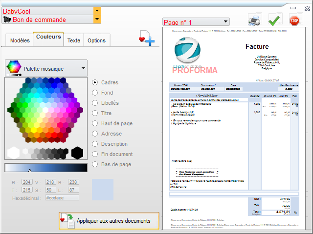 Pour créer vos modèles, vous pouvez paramétrer les couleurs en sélectionnant une palette de couleurs et en attribuant la couleur choisie à un élément de votre document :