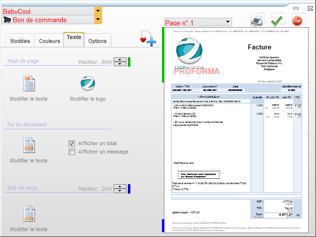 Ce module permet également de créer rapidement les textes du haut de page, de la fin du document et du bas de page avec le style de votre choix. Il est possible de modifier la hauteur du haut de page et du bas de page et de changer le logo.