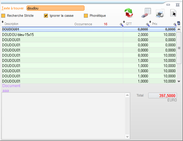 Cet outil de recherche permet de retrouver un document précis dans une liste de documents du même type, grâce à son contenu. La recherche peut se faire de façon stricte, mais il est aussi possible d’ignorer la casse ou de faire une recherche phonétique. Les résultats de vos recherches peuvent être imprimés.