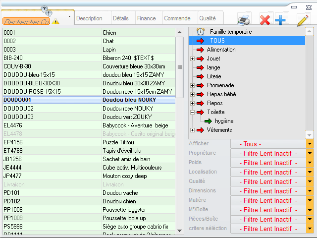 Recherches : les recherches peuvent se faire par code article, par description d’article, par la référence fournisseur, par famille, par le splitter (séparateur intégré dans le code article), par code-barres.