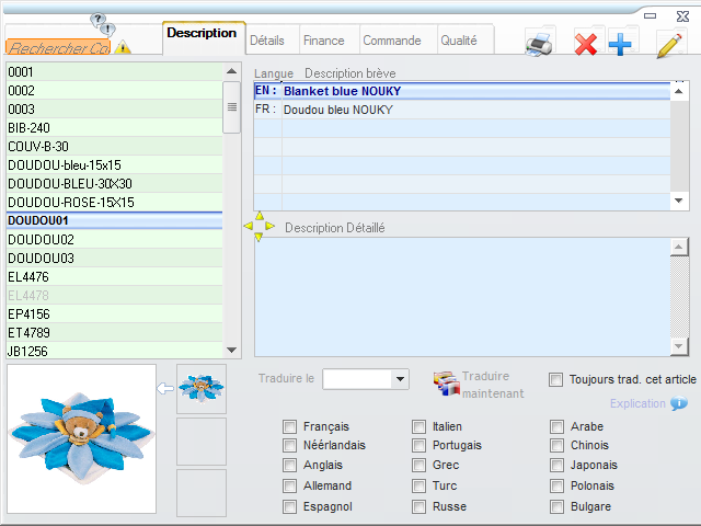 Descriptif : lors de la création de l’article, il reçoit un code, des descriptions (courte et longue), et éventuellement une traduction de la description. Vous pouvez illustrer votre article en intégrant une image dans la fiche signalétique. Vous pouvez éventuellement ajouter un code-barres.