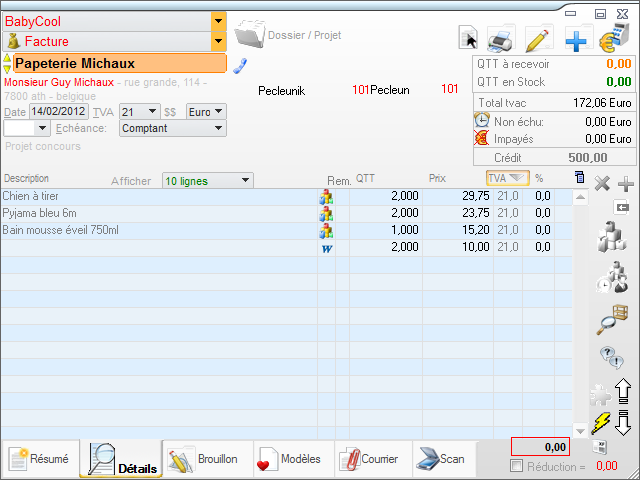 pex. définir le taux de TVA utilisé, établir des règles de transfert (pex bon de livraison vers facture,...), paramétrer l'impression des documents, créer un bas et un haut de page par document et par langue, choisir les couleurs des libellés/conteurs/fonds de vos documents, configurer l'impression du n° de fax, insérer le logo de votre entreprise par type de document, etc...