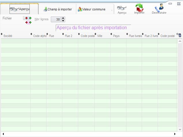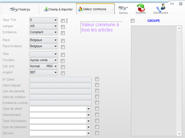 Module permettant d’importer des bases de données client et fournisseur d’un fichier excel, en spécifiant les champs qui seront variables pour chaque destinataire et les champs qui contiennent une valeur commune à tous les destinataires. Une prévisualisation des premières lignes du fichier à importer vous permet de contrôler avant d’importer le fichier. Cette fenêtre permet d’accéder directement la fiche signalétique des destinataires.