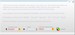 Ce module permet de substituer une unité par une autre pour l’ensemble des articles dans les documents déjà créés. L’unité reprise dans la fiche signalétique de l’article sera également remplacée, ainsi que les quantités des lots et les mouvements de lots.