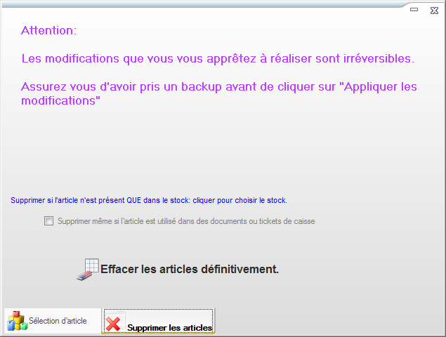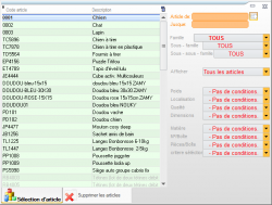 Les articles à supprimer sont filtrés par le code article, par les familles ou par les critères personnalisables.