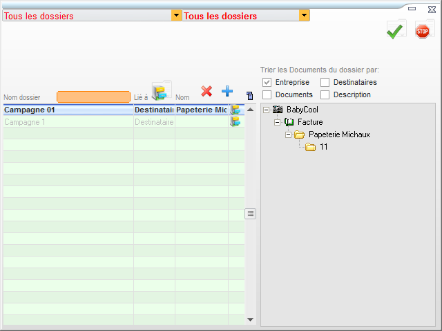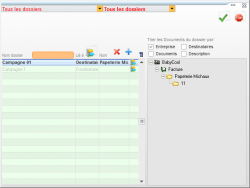 Un dossier peut être déclassé. Un filtre permet de n’afficher que les dossiers actifs ou les dossiers déclassés, ou les deux à la fois. Les dossiers peuvent être triés par entreprise, par destinataire, par document ou par description.