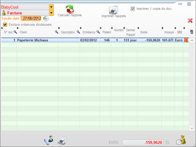 Il est possible d’exclure les créances douteuses de la liste des rappels. Ce module offre un accès direct à l’annuaire, il permet d’imprimer un seul document des documents listés et le montant total de tous les documents listés est affiché. Il est possible d’afficher l’historique des rappels.