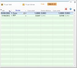 Vous pouvez encoder à la date du jour le cours d’achat et le cours de vente d’une devise par rapport à une devise de référence. Le module offre la possibilité d’afficher les cours de change triés par date ou triés par devise.