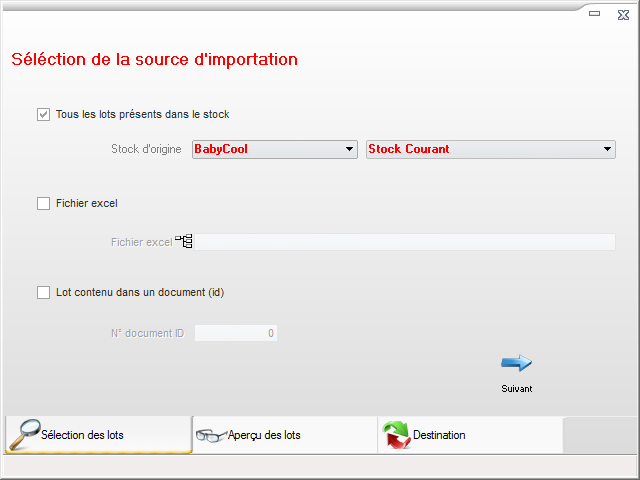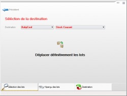 Après avoir sélectionné une source d’importation (pex. un stock spécifique, un fichier excel ou un lot contenu dans un document), un aperçu de tous les lots à déplacer est affiché. Le choix d’un stock de destination permet de déplacer définitivement les lots.